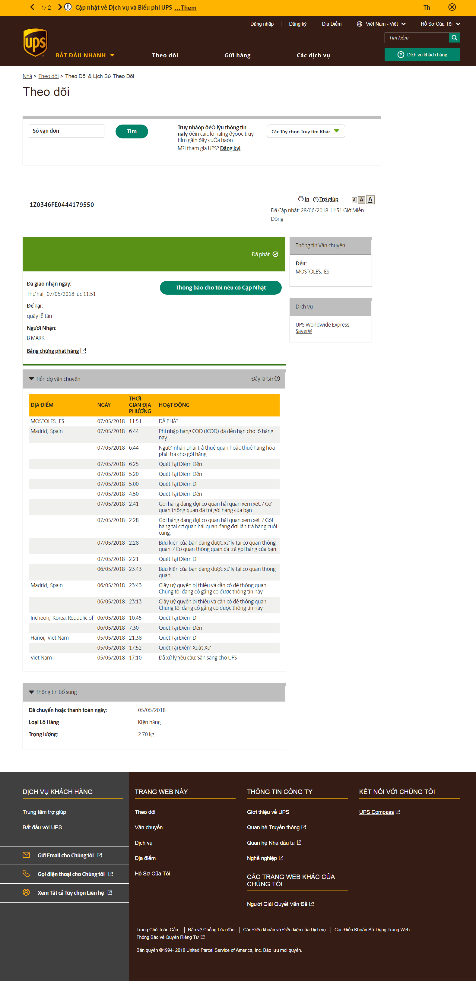 3. Nhìn vào kết quả tra cứu UPS Tracking ta biết được :